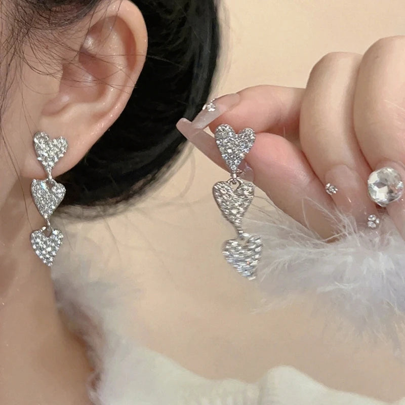 New Trend Three-layers Hearts Hanging Earrings for Women Silver Color Metal Multi-layers Luxury Crystal Dangle Earrings 2026 new