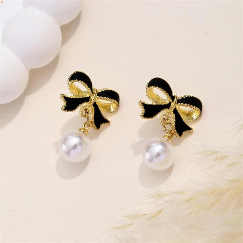Red Black Enamel Bowknot Women's Dangle Earrings Small Pearl Pendants Korean Sweet Lovey Drop Earrings pendientes de mujer