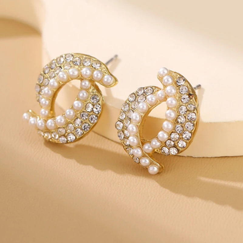 2025 New Arc Stud Earrings for Women Imitation Pearl Crystal Luxury Wedding Ear Jewelry Hollow Cross Shape Small Earrings