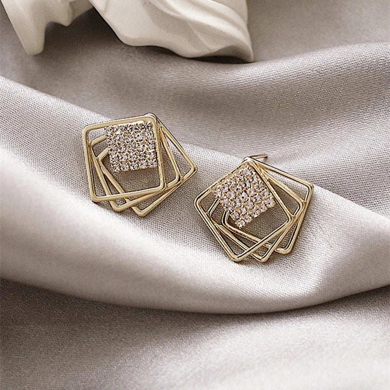 2024 New In Square Stud Earrings for Women Crystal Small Earrings Three-layers Hollow Rhombus Female Ear Jewelry brincos