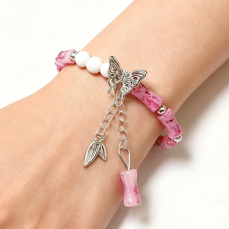 2025 New Pink Marble Beaded Bracelet with Silver Color Butterfly Pendants Adjustable Free Size Women's Bangles pulseras mujer