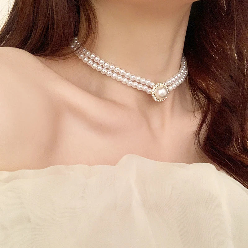 Two-layers Pearl Chokers for Women Luxury Crystal in Middle Double-layers Imitation Pearl Beads Wedding Neck Jewelry collar