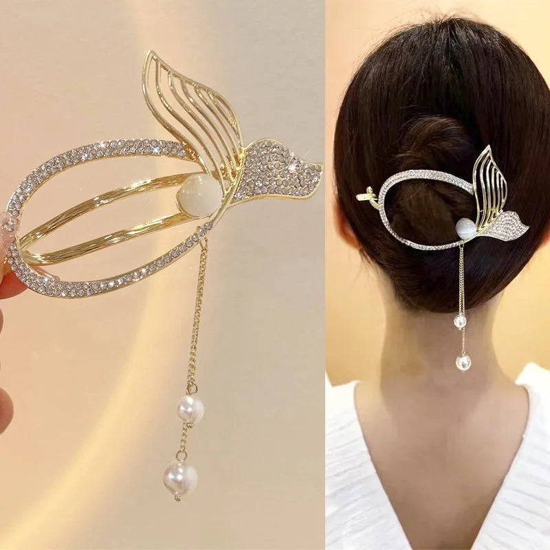 New Fashion Crystal Fish Tail Barrettes for Women Imitation Pearl Pendants Temperamental Tassel Fairy Hair Clips Female Hairwear