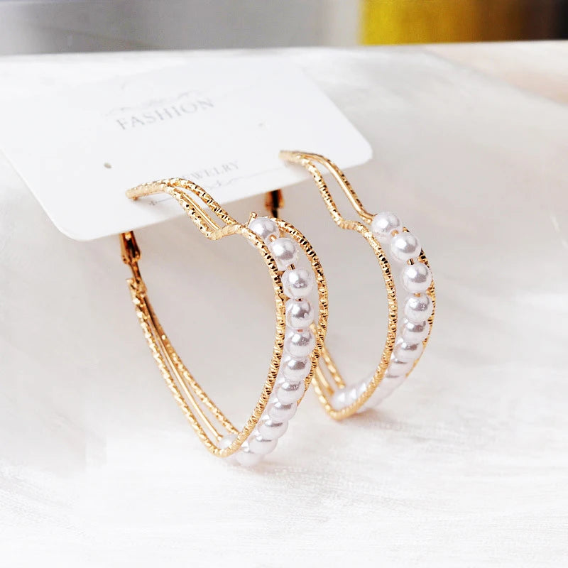 Exaggerated Two-layers Metal Heart Hoop Earrings Oversize Simulated Pearl LOVE Hearts Loop Earrings Big Bohemian Ear Decoration
