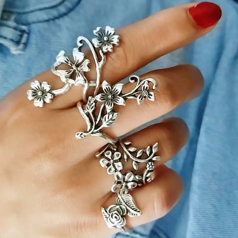 4pcs/lot Antique Silver Color Women's Rings Vines Leaves Flowers Shape Vintage Fingers Accessories Bohemian Rings Set for Female